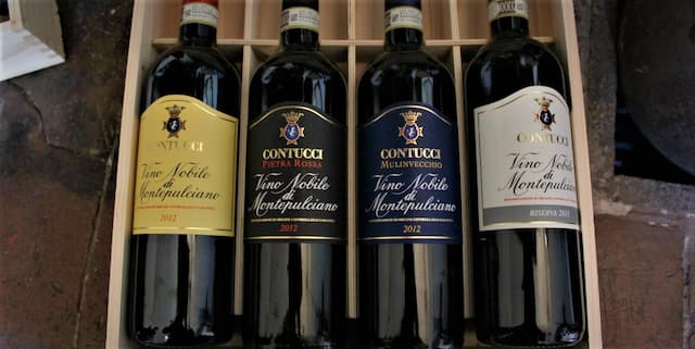 Винодельческая зона DOC Vino Nobile di Montepulciano была учреждена в 1960 году, в 1980-м ее статус был повышен до DOCG. Зона производства Вино Нобиле полностью находится в границах коммуны Монтепульчано в провинции Сиены. По производственному регламенту Vino Nobile di Montepulciano DOCG выпускаются красные вина, имеющие в составе минимум 70% Санджовезе местного биотипа «Пруньоло Джентиле» – Prugnolo Gentile, допускается использование и других сортов, разрешенных в Тоскане (не более 30%), включая белые (но не более 5%, кроме винограда Мальвазия Бьянка и других ароматных сортов). Чаще всего Санджовезе дополняют местные сорта-автохтоны: Канайоло, Маммоло, Колорино. Выдержка Vino Nobile di Montepulciano DOCG составляет не менее двух лет, из которых по меньшей мере год вино проводит в деревянных бочках. Вино Нобиле категории Riserva выдерживается не менее трех лет, из которых минимум полтора года – в деревянных бочках и 6 месяцев в бутылках. Вино Нобиле ди Монтепульчано созревает быстрее, чем его великий сосед Брунелло ди Монтальчино, но многолетнее «резервное» Вино Нобиле хозяйства Contucci и других исторических производителей (например, Cerraia, Castelli del Grevepesa, Fassati, Vecchia Cantina di Montepulciano и др.) доказывает, что оно переносит длительную выдержку в 40 и более лет. Vino Nobile di Montepulciano имеет интенсивный рубиново-красный цвет, переходящий в гранатовый при выдержке. Вино обладает интенсивным иногда эфирным ароматом с характерными фруктовыми нотами вишни и черешни, цветов фиалки и пряностей; вкус вина – структурированный, сбалансированный и элегантный с ярко выраженными танинами, гарантирующими хорошую продолжительность жизни вина.